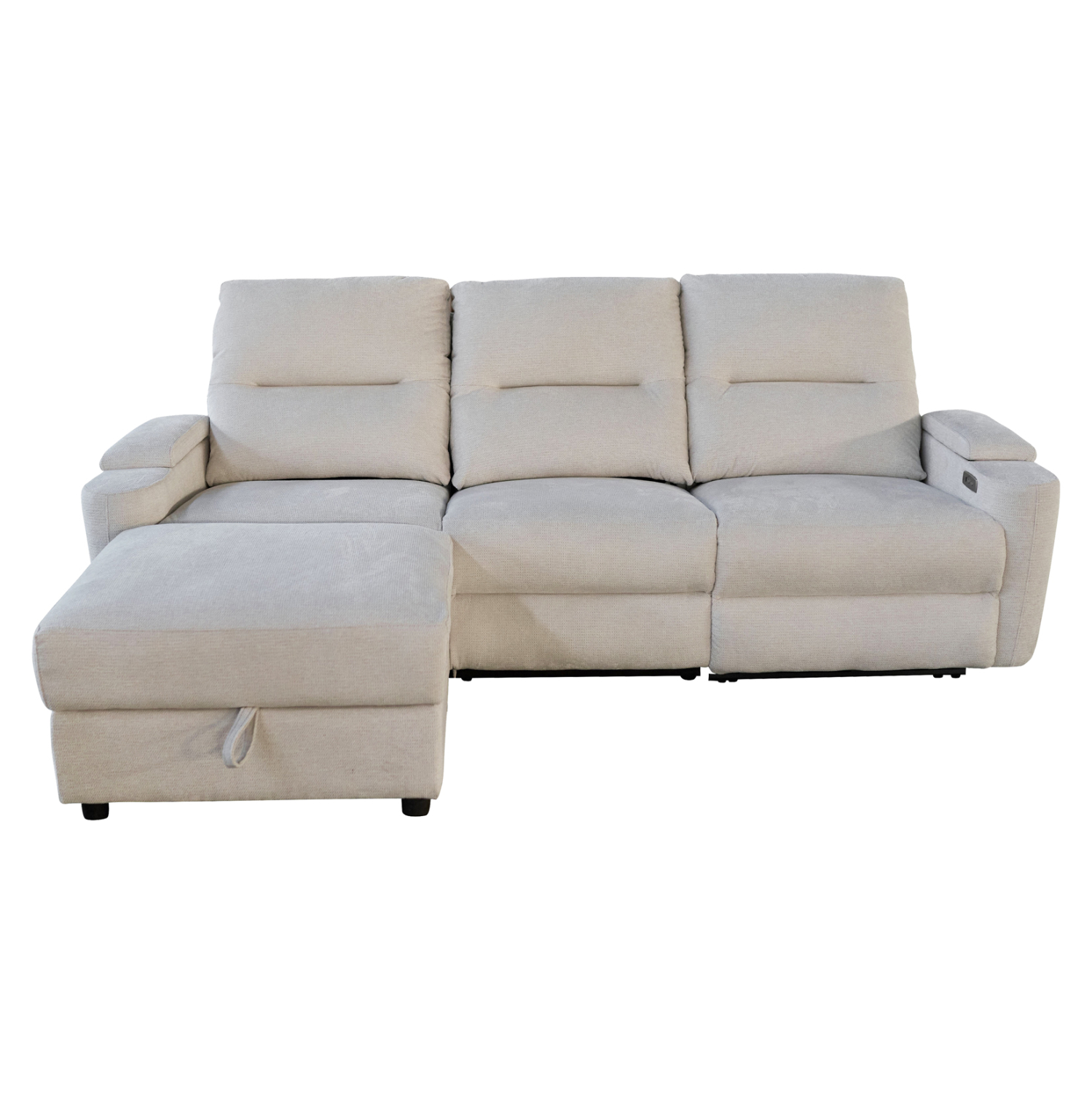 Τριθέσιος Αριστερός Γωνιακός Καναπές SYNTHIA– Μπεζ Ύφασμα, με Ηλεκτρικό Ανακλινόμενο Κάθισμα, Αποθηκευτικό Χώρο & Πτυσσόμενο Τραπέζι