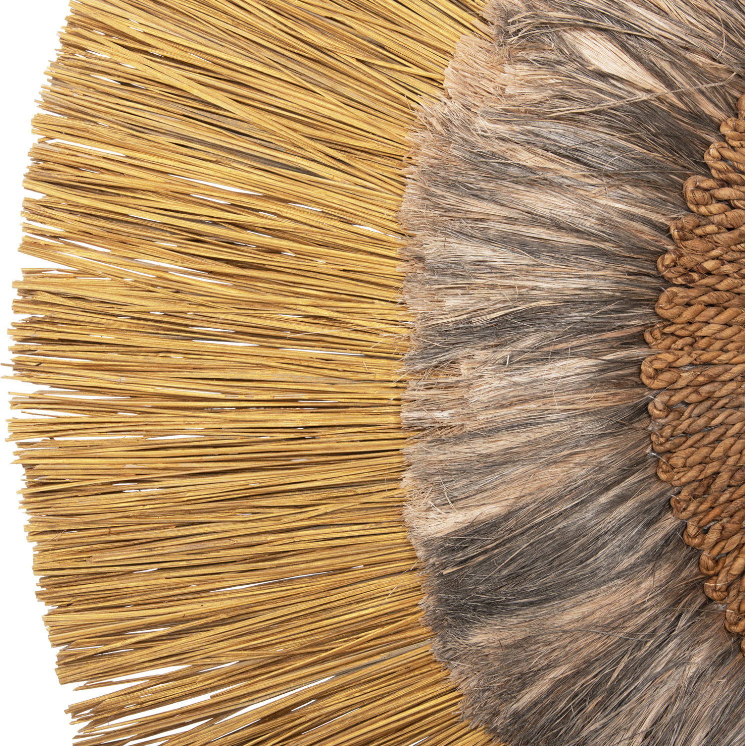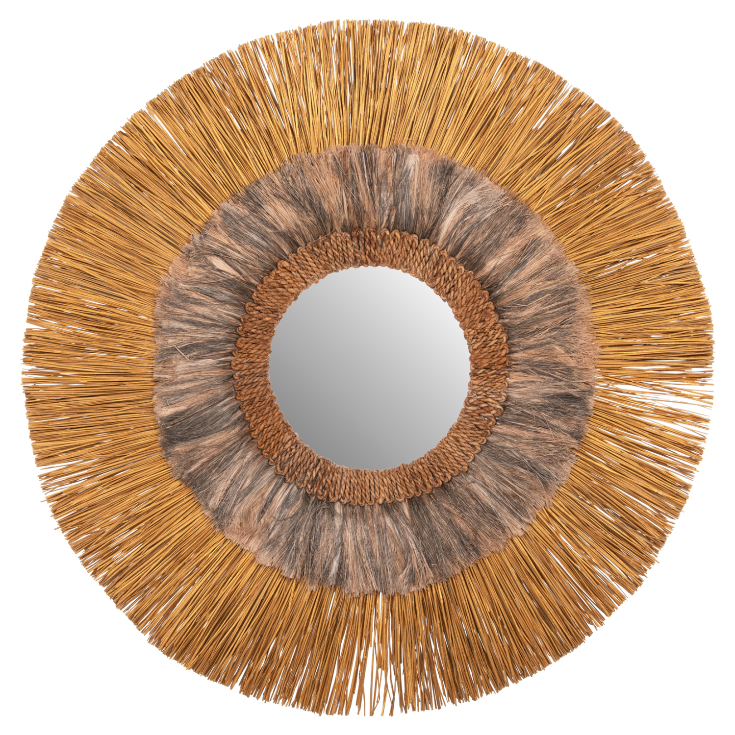 O στρογγυλός καθρέπτης LH10.7796 είναι πραγματικά ένα εντυπωσιακό κομμάτι στην διακόσμηση του χώρου σας! Το design του είναι όμορφο με πλαίσιο από 2 δακτυλίους με φυσικά υλικά. Ο μικρότερος δακτύλιος αποτελείται από ίνες κάνναβης Μανίλας σε black wash χρώμα, ενώ ο μεγαλύτερος δακτύλιος αποτελείται από Mendong Grass σε χρυσό χρώμα. Ο καθρέπτης στο κέντρο συμπληρώνει με όμορφο τρόπο αυτό το διακοσμητικό κυρίως κομμάτι.