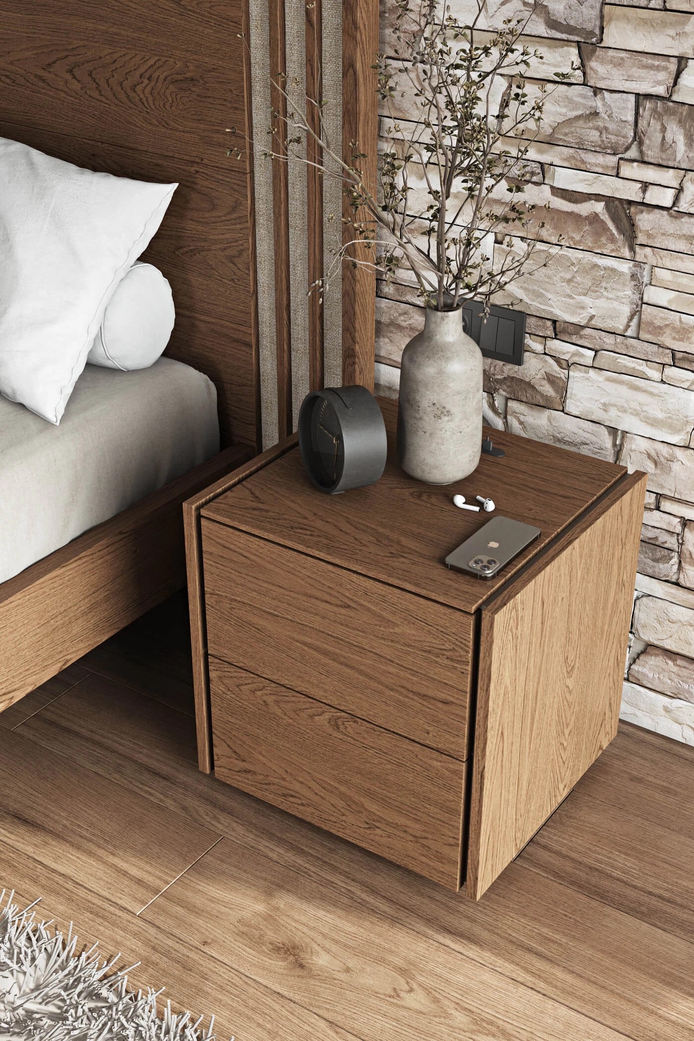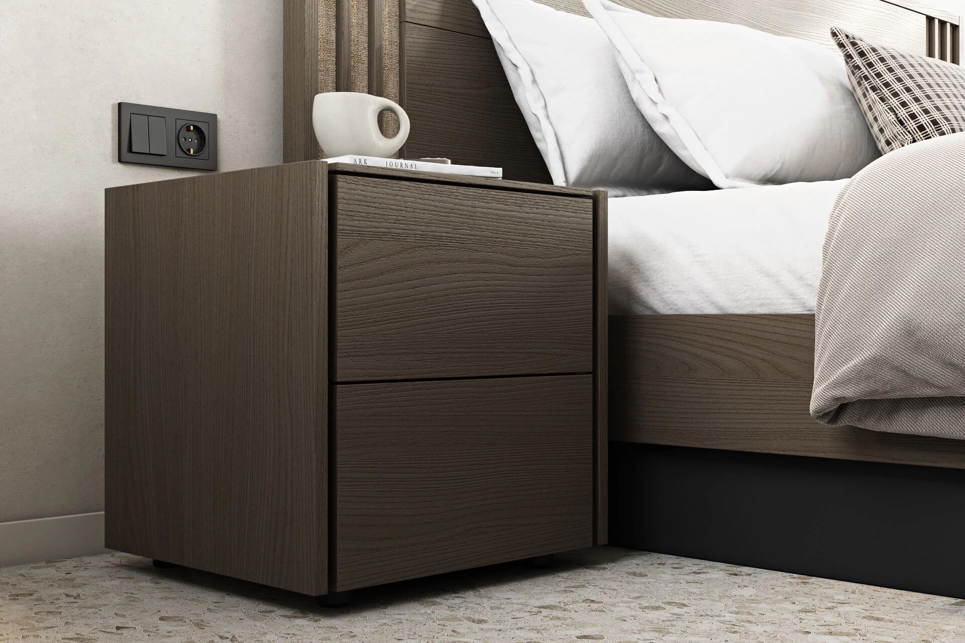 Το κομοδίνο διαθέτει δύο συρτάρια αποθήκευσης ίδιου μεγέθους και το εσωτερικό τους είναι δίχρωμο κατασκευασμένο από ανάγλυφη μελαμίνη. Προαιρετικά μπορούν να ενσωματωθούν διαφόρων ειδών usb φόρτισης!