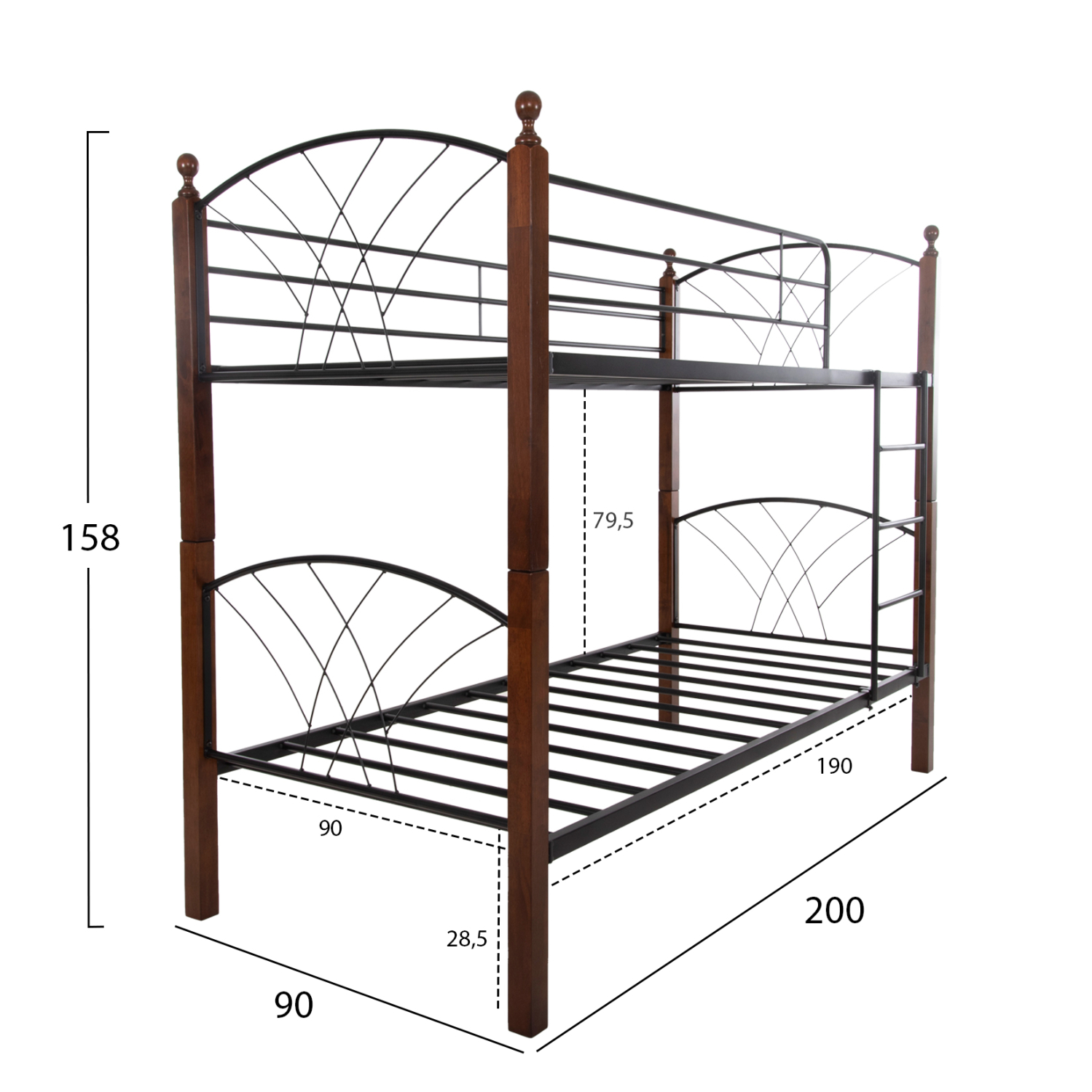 Σας παρουσιάζουμε τo κρεβάτι-κουκέτα STOREY σε μια σύνθεση μετάλλου και ξύλου. Τα 4 πόδια-κολώνες είναι τα ξύλινα κομμάτια της σύνθεσης σε χρώμα ΚΑΡΥΔΙ, ενώ όλα τα υπόλοιπα μέρη είναι μεταλλικά σε ΜΑΥΡΟ χρώμα. Η πρόσβαση στο επάνω κρεβάτι γίνεται με μια όμορφη μεταλλική σκάλα που στηρίζεται στις 2 μεταλλικές βάσεις των κρεβατιών. Στο επάνω κρεβάτι υπάρχουν τα απαραίτητα πλαϊνά προστατευτικά (κάγκελα) που προσφέρουν ασφάλεια από πτώσεις. Τέλος, οι μεταλλικές δοκοί πάνω στις οποίες στηρίζονται τα στρώματα είναι ενωμένες με το πλαίσιο διευκολύνοντας την συναρμολόγηση!