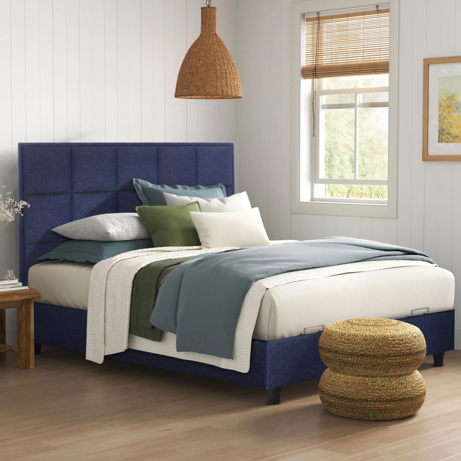 Εμείς, γέλιο δεν είναι η δουλειά μας να προσφέρουμε, αλλά σίγουρα μπορούμε να σας εξασφαλίσουμε τον καλό ύπνο! Με το κρεβάτι ALBA δεν θα ζητήσετε ποτέ κάτι άλλο. Το κεφαλάρι είναι ψηλό και επενδυμένο με τετραγωνισμένη καπιτονέ τεχνοτροπία, ενώ και όλη η επένδυση του κρεβατιού είναι από εξαιρετικής ποιότητας ύφασμα. Το μπλε χρώμα σε όλο το κρεβάτι είναι εντυπωσιακό και μπορεί να συνδυαστεί με πληθώρα διακοσμητικών μοτίβων. Όμως, το κύριο χαρακτηριστικό αυτού του κρεβατιού είναι ότι δεν ακολουθεί την κλασική κατασκευή με τις τάβλες του σομιέ για την στήριξη του στρώματος, αλλά αντίθετα αποτελείται από μια συνεχόμενη επιφάνεια (2 μοριοσανίδες) πάνω στην οποία τοποθετείται το στρώμα. Επιπλέον, η κάθε επιφάνεια από μοριοσανίδα ανασηκώνεται με μεταλλικό μηχανισμό ασφαλείας με 4 αμορτισέρ και μεταλλικές λαβές προσφέροντας έναν μεγάλο αποθηκευτικό χώρο. Σε διαστάσεις στρώματος 160×200 εκ. θα χωρέσει κάθε σας όνειρο!