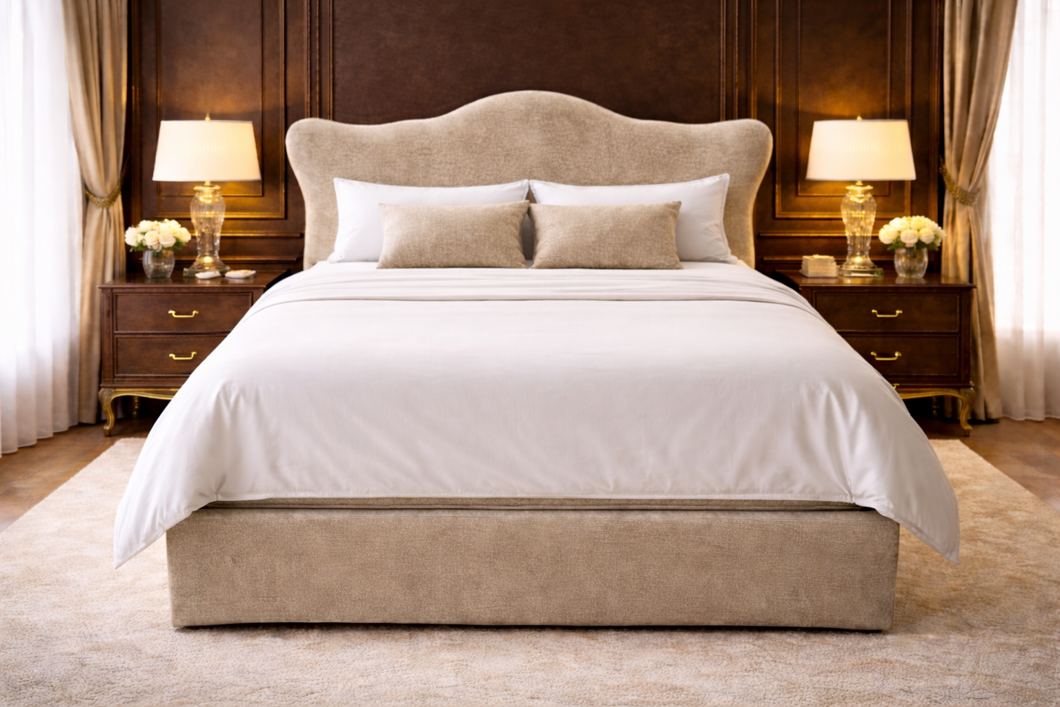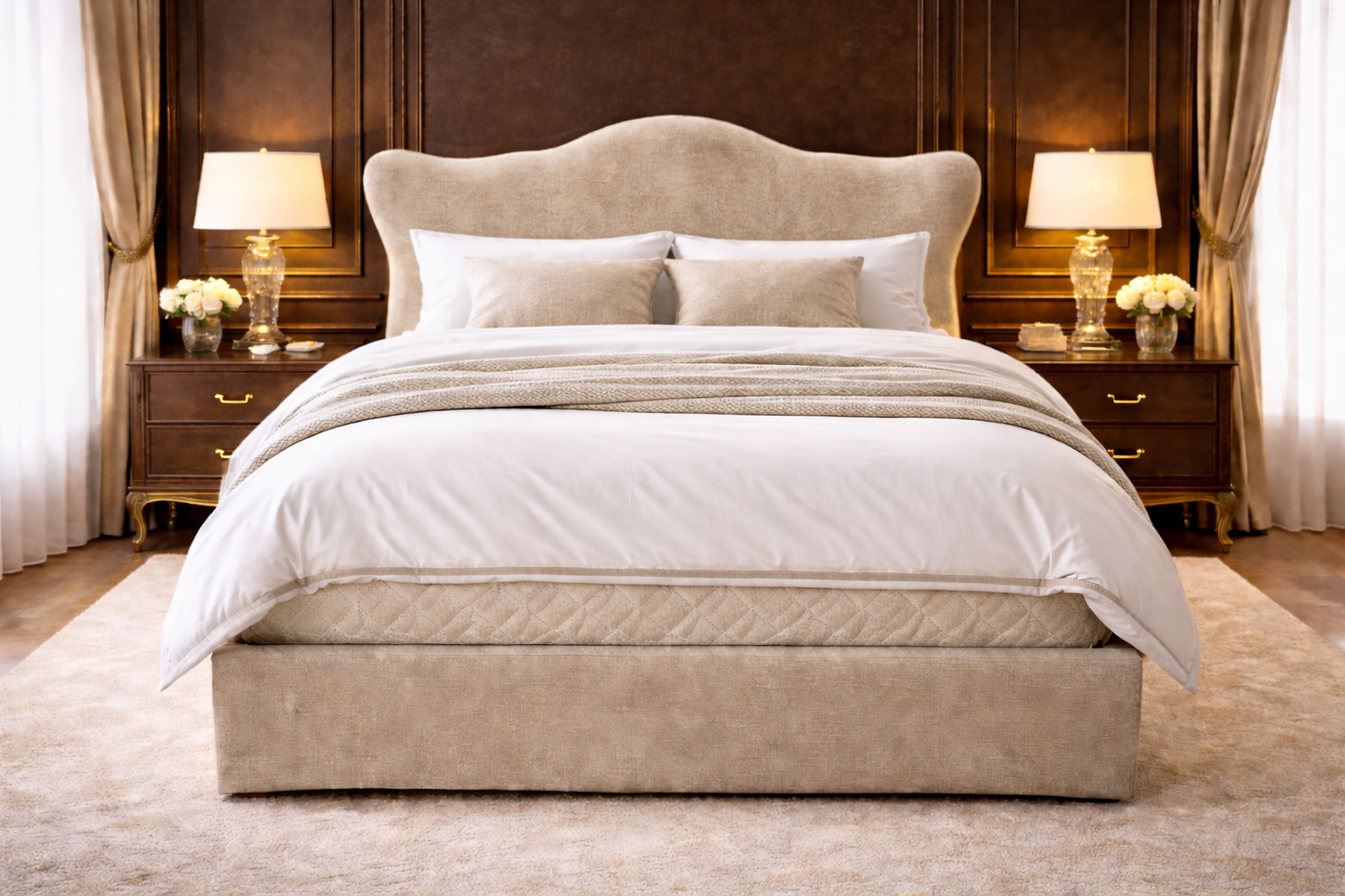 Αναβαθμίστε το υπνοδωμάτιό σας με ένα κρεβάτι που αποπνέει αριστοκρατική κομψότητα και διαχρονική φινέτσα. Το εντυπωσιακό κεφαλάρι με τις απαλές, καμπυλωτές γραμμές δημιουργεί ένα εκλεπτυσμένο αποτέλεσμα, προσθέτοντας χαρακτήρα και πολυτέλεια στον χώρο.Η υφασμάτινη επένδυση σε ζεστή μπεζ απόχρωση χαρίζει φωτεινότητα και αρμονία, ενώ η στιβαρή, χαμηλή βάση ενισχύει την αίσθηση σταθερότητας και ποιότητας. Ο σχεδιασμός του συνδυάζει κλασικά στοιχεία με σύγχρονη αισθητική, καθιστώντας το ιδανική επιλογή για κομψά και προσεγμένα υπνοδωμάτια.