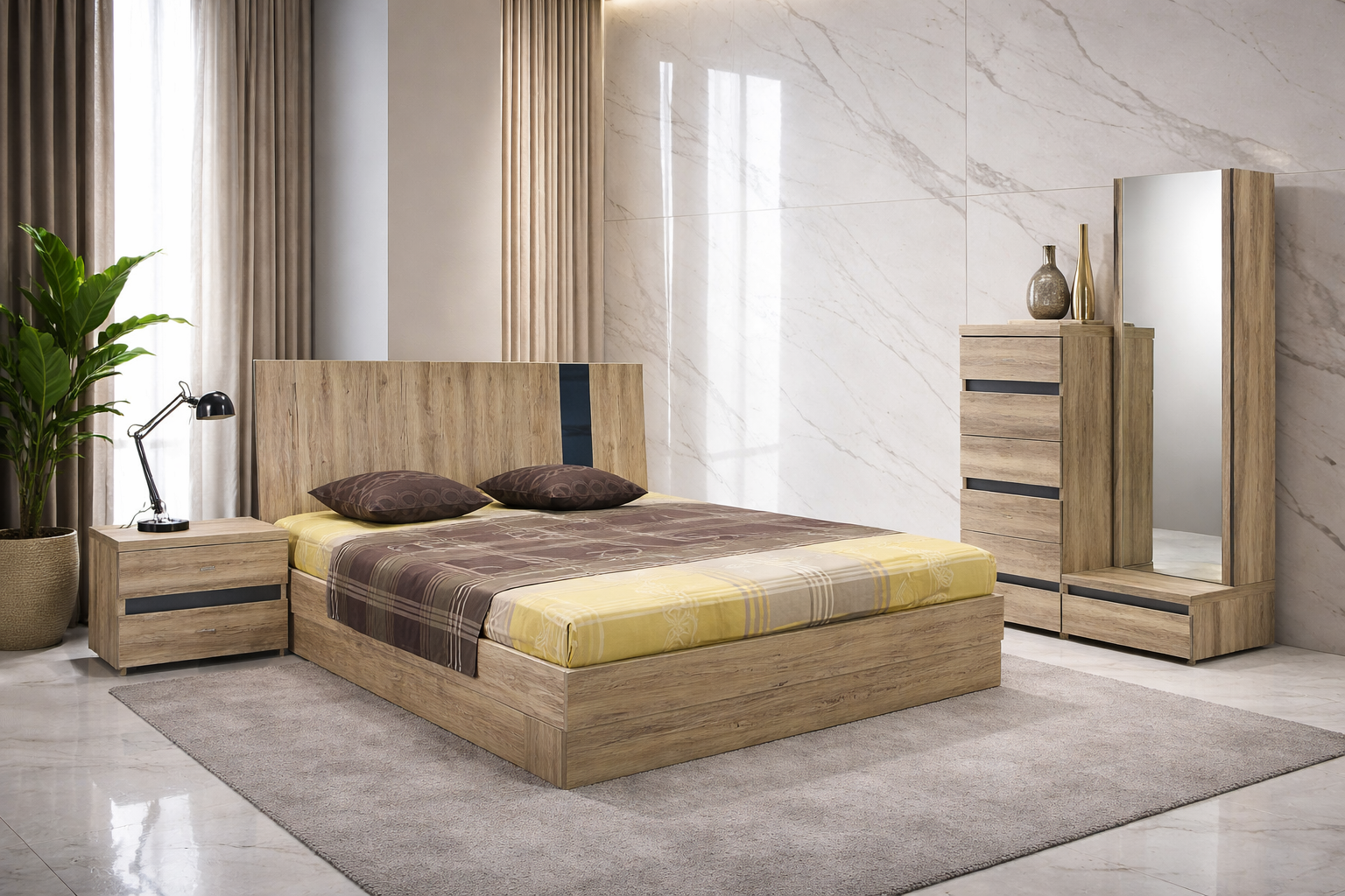 Το κρεβάτι ξεχωρίζει για το εντυπωσιακό κεφαλάρι με διακριτική κάθετη λεπτομέρεια σε σκούρο τόνο, προσδίδοντας χαρακτήρα και μοντέρνα αισθητική. Τα κομοδίνα και η συρταριέρα με καθρέφτη ολοκληρώνουν το σύνολο, προσφέροντας άνετους αποθηκευτικούς χώρους και πρακτικές λύσεις για την καθημερινότητα.
