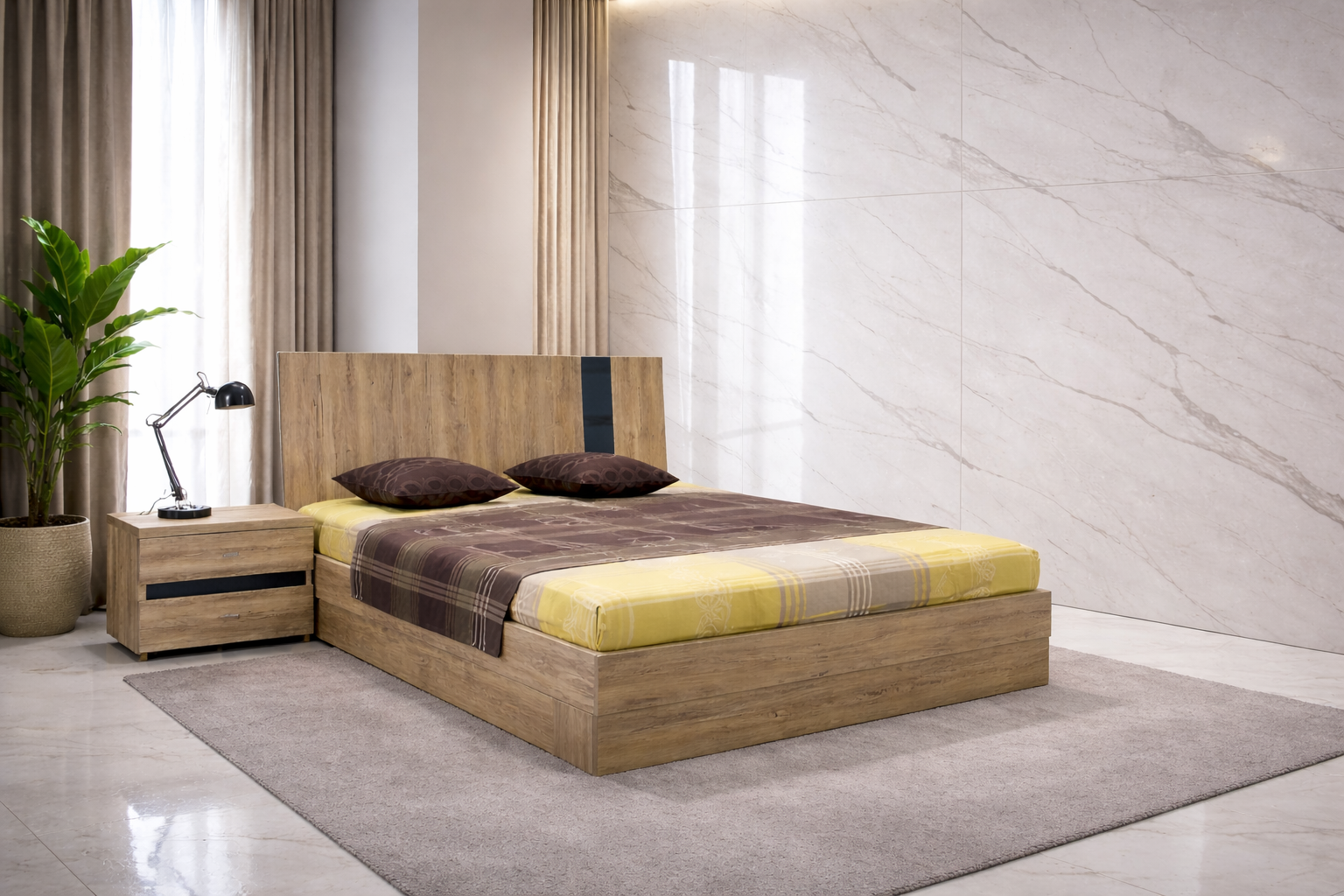 Ανανεώστε το υπνοδωμάτιό σας με ένα καλαίσθητο κρεβάτι που συνδυάζει τη ζεστασιά της φυσικής όψης ξύλου με μοντέρνες λεπτομέρειες αντίθεσης. Ο ισορροπημένος σχεδιασμός του δημιουργεί έναν χώρο άνεσης και χαλάρωσης, ιδανικό για σύγχρονα σπίτια.