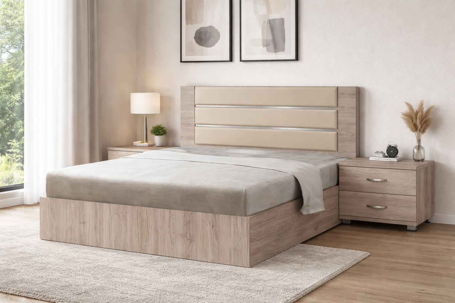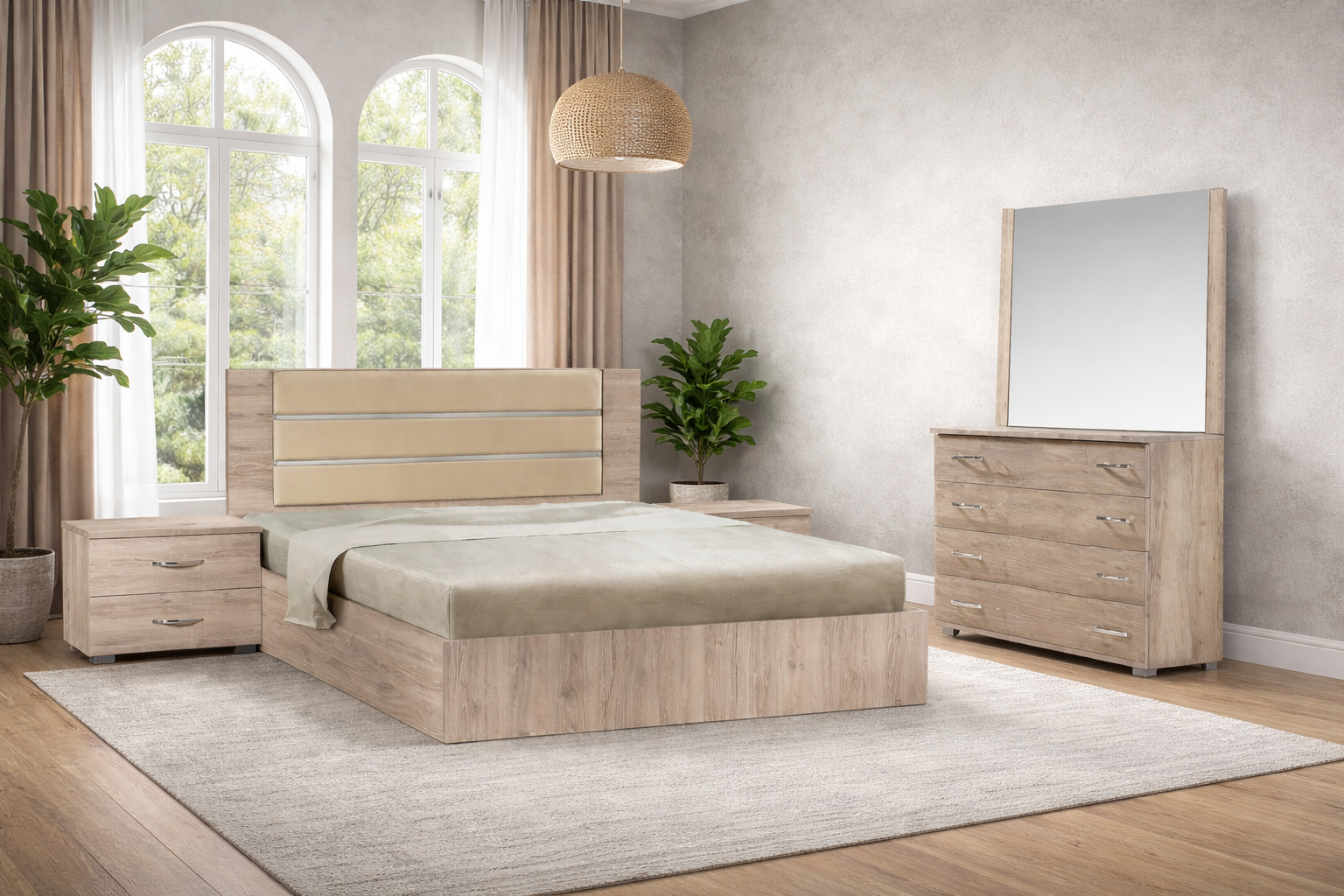 Το κρεβάτι ξεχωρίζει για το επενδυμένο κεφαλάρι σε απαλή απόχρωση με οριζόντιες λεπτομέρειες, προσθέτοντας κομψότητα και άνεση. Τα κομοδίνα και η συρταριέρα με καθρέφτη ολοκληρώνουν αρμονικά το σετ, προσφέροντας πρακτικούς αποθηκευτικούς χώρους και λειτουργικότητα για την καθημερινότητα.