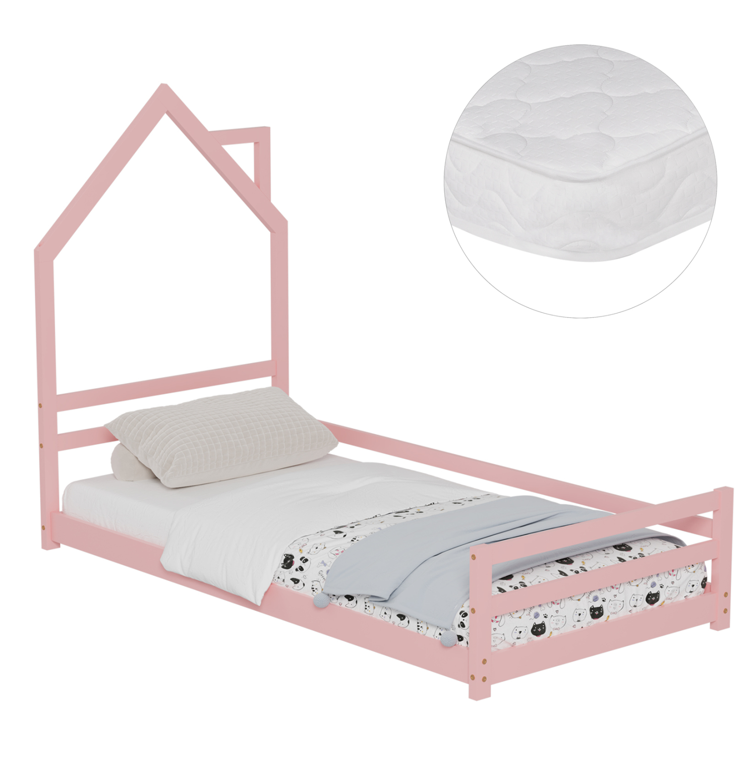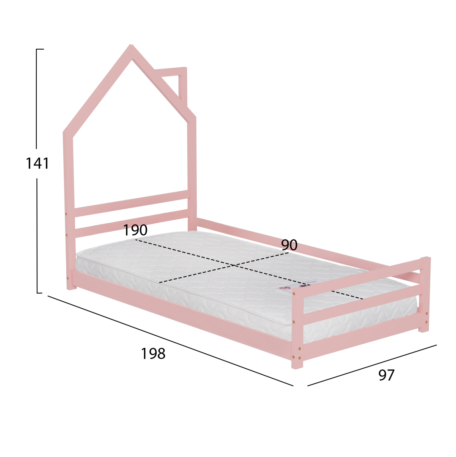 Το παιδικό κρεβάτι HOUSER τύπου Montessori σε διάσταση για στρώμα 90×190εκ, είναι κατασκευασμένο από ξύλο πεύκου σε ΡΟΖ χρώμα. Tο κεφαλάρι έχει σχήμα σπιτιού με καμινάδα και τα πόδια είναι εξαιρετικά χαμηλά, ενώ το στρώμα τοποθετείται σε τάβλες από κόντρα-πλακέ ξυλεία.