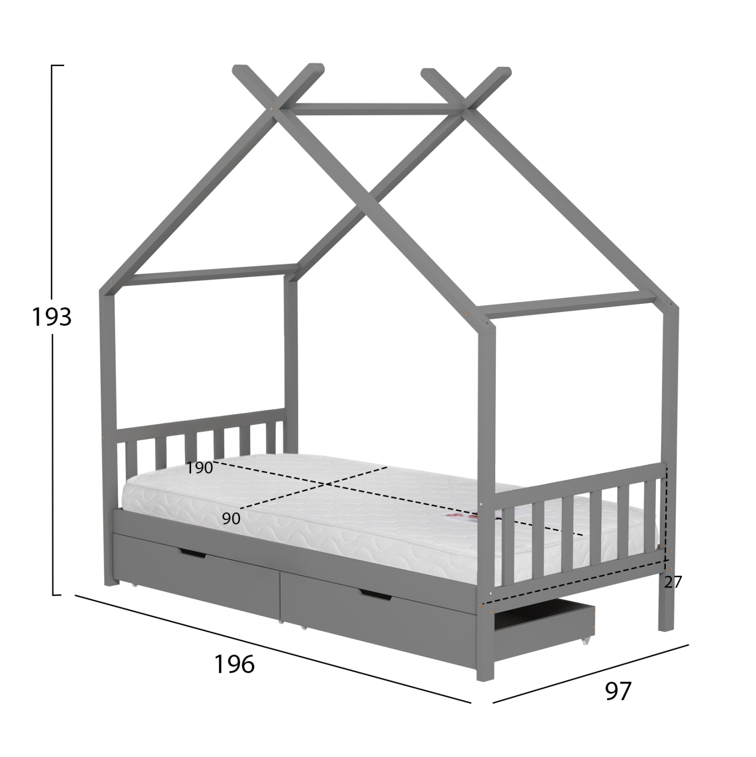 Το παιδικό κρεβάτι KLARICE τύπου Montessori σε διάσταση για στρώμα 90×190εκ, είναι κατασκευασμένο από ξύλο πεύκου σε ΓΚΡΙ χρώμα. Όλο το κρεβάτι έχει σχήμα σπιτιού και διαθέτει 2 συρτάρια στο κάτω μέρος ως αποθηκευτικό χώρο αλλά και προστατευτικό κάγκελα σε 2 πλευρές, ενώ το στρώμα τοποθετείται σε τάβλες από κόντρα-πλακέ ξυλεία.