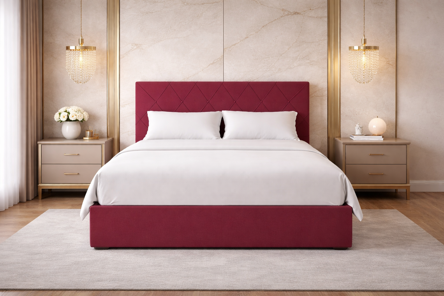 Δώστε ένταση και χαρακτήρα στο υπνοδωμάτιό σας με ένα κρεβάτι που τραβά τα βλέμματα από την πρώτη στιγμή. Το καπιτονέ κεφαλάρι με διακριτικές ραφές σε γεωμετρικό σχέδιο προσφέρει μία κομψή και ταυτόχρονα δυναμική αισθητική, δημιουργώντας ένα εντυπωσιακό focal point στον χώρο.Η υφασμάτινη επένδυση σε βαθιά κόκκινη απόχρωση αποπνέει πολυτέλεια και πάθος, ενώ η λιτή, χαμηλή βάση ενισχύει τη σύγχρονη γραμμή του σχεδιασμού. Ο στιβαρός σκελετός εξασφαλίζει σταθερότητα και αντοχή στον χρόνο, καθιστώντας το ιδανική επιλογή για καθημερινή χρήση.