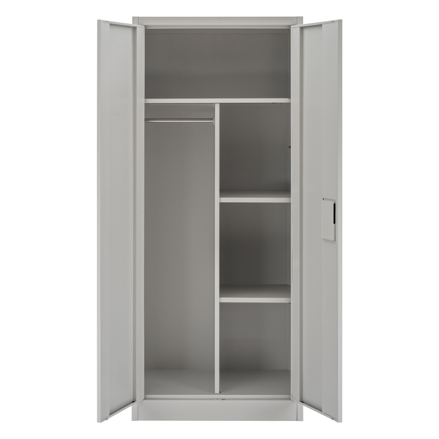 Η LH10.5961.01 είναι μια πρακτικότατη μεταλλική ντουλάπα που έχει φτιαχτεί με γνώμονα την χωρητικότητα και την ανθεκτικότητα. Είναι δίφυλλη με τις δύο πόρτες να κλείνουν ακριβώς στην μέση της κατασκευής, ενώ το εσωτερικό είναι χωρισμένο σε 3 κύριους χώρους με μεταλλικό χώρισμα σε σχήμα Τ. Το επάνω μέρος είναι ενιαίο σαν παταράκι, ενώ η μία πλευρά διαθέτει μεταλλική μπάρα για κρέμαση αντικειμένων και η άλλη διαθέτει 2 ράφια που δημιουργούν 3 επίπεδα αποθήκευσης. Οι πόρτες διαθέτουν κλειδαριά που κλειδώνει με κλειδί, ενώ το χρώμα της ντουλάπας είναι πολύ ανοιχτό γκρι.