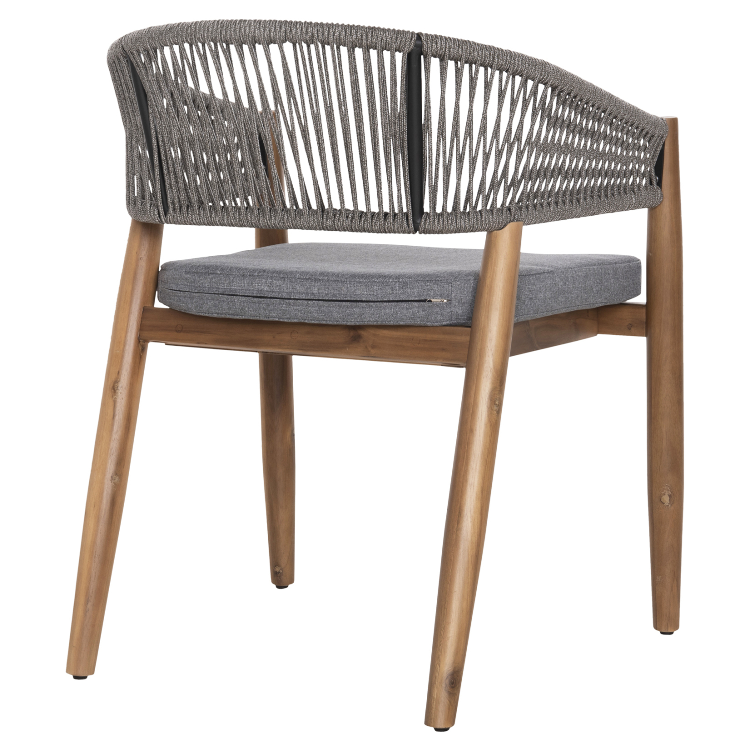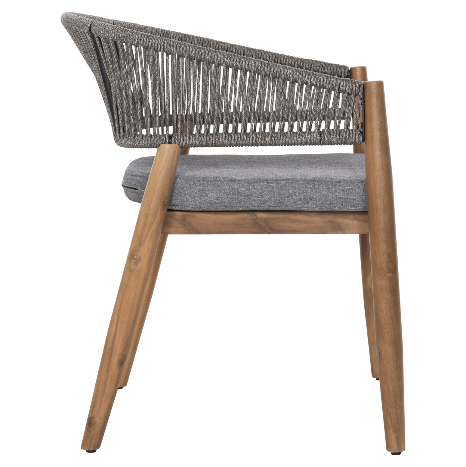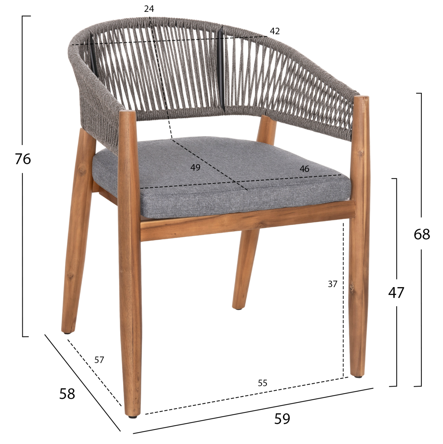 Η πολυθρόνα τραπεζαρίας εξωτερικού χώρου NAVAN συνδυάζει αρμονικά διαφορετικά υλικά κατασκευής. Τα πόδια είναι από ξύλο ακακίας στο ΦΥΣΙΚΟ του χρώμα, ενώ ο σκελετός της πλάτης είναι μεταλλικός με πλέξη από nylon σχοινί σε ΓΚΡΙ χρώμα. Το κάθισμα διαθέτει μαξιλάρι με πολυεστερικό ύφασμα επίσης σε ΓΚΡΙ χρώμα. Οι σχεδιαστικές γραμμές είναι κομψές και με γνώμονα την άνεση του χρήστη και θα αποτελέσει το κέντρο ενδιαφέροντος οπουδήποτε και αν τοποθετηθεί, ιδιαίτερα όμως αν συνδυαστεί με το ανάλογο τραπέζι.