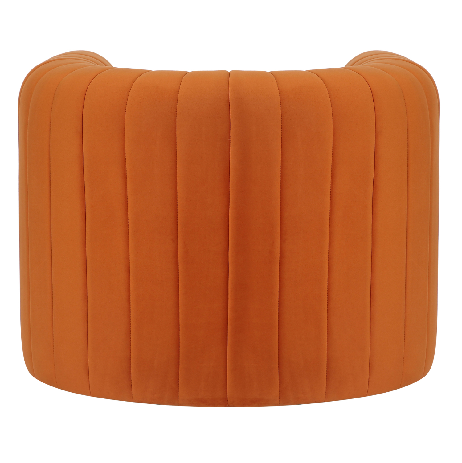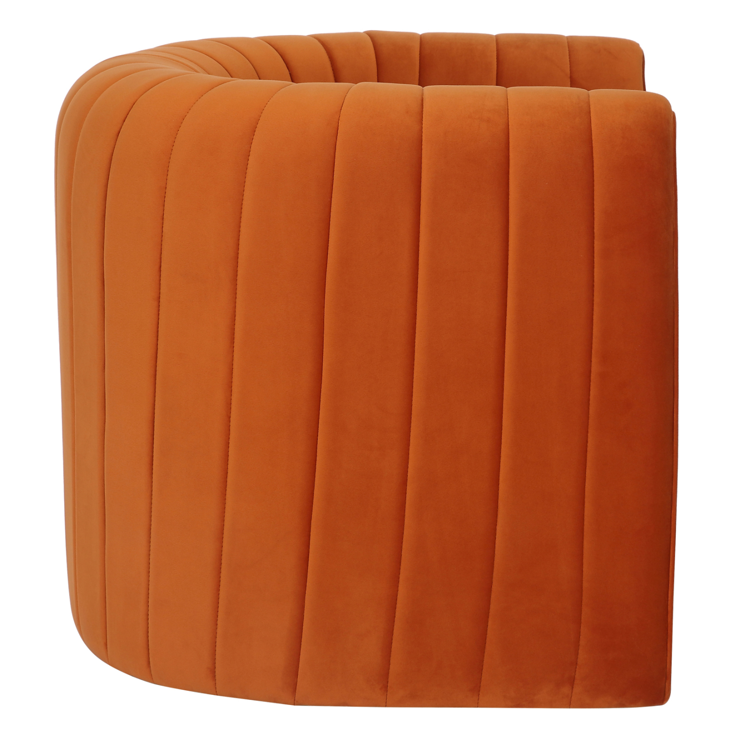 Η πολυθρόνα εσωτερικού χώρου RIKER σε ΠΟΡΤΟΚΑΛΙ χρώμα είναι μοντέρνα και πανέμορφη. Το χαρακτηριστικό που κάνει αυτή την πολυθρόνα να ξεχωρίζει είναι οι καμπύλες του μεταλλικού σκελετού που σχηματίζουν την ημικυκλική πλάτη με τα μπράτσα και όλη η κατασκευή φτάνει μέχρι κάτω δημιουργώντας ουσιαστικά και τα πόδια της πολυθρόνας ως φυσική συνέχεια του design. Μια πολυθρόνα με βελούδινη επένδυση που είναι σίγουρο ότι θα μαγνητίσει το ενδιαφέρον όλων.