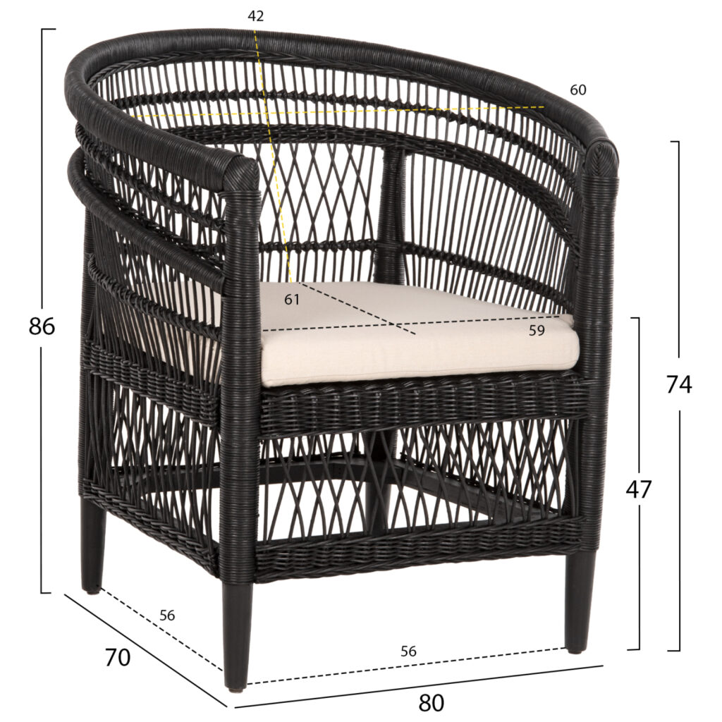 Ολόκληρη η πολυθρόνα είναι κατασκευασμένη από φυσικό Rattan. Το Rattan είναι το καλύτερο και το πιο ευρέως χρησιμοποιούμενο φυσικό υλικό για πλεκτές κατασκευές, όπως wicker κτλ. Μάλιστα, το rattan που καλλιεργείται στην Ινδονησία είναι το ποιοτικότερο και ανθεκτικότερο υλικό από παρόμοια που καλλιεργούνται σε άλλες περιοχές.