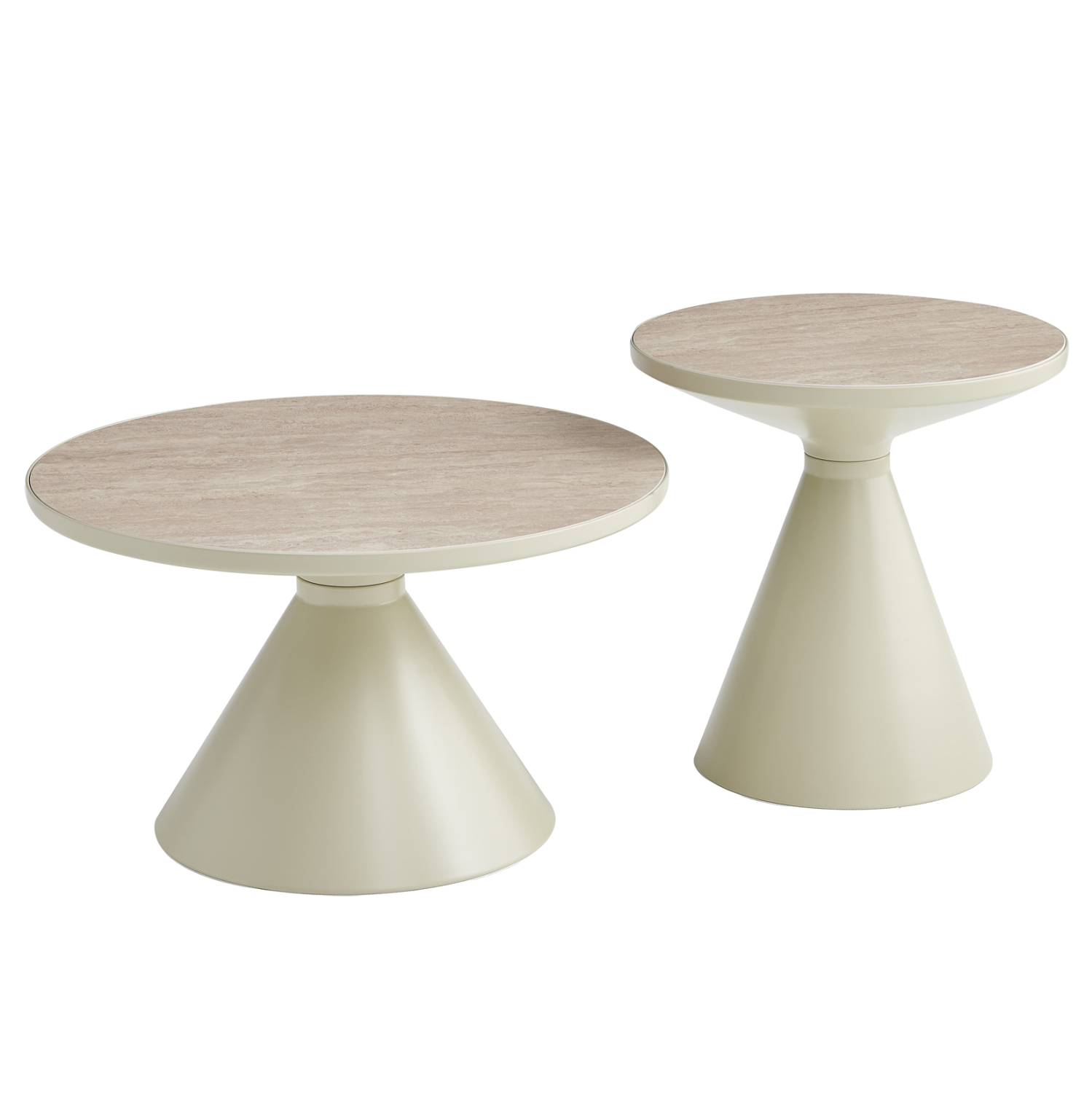 Το σετ τραπεζιών για το σαλόνι LYNX από την SYMETRON, αποτελείται από 2 μεταλλικά τραπεζάκια στρογγυλά διαφορετικών μεγεθών. Οι βάσεις τους έχουν σχήμα κώνου σε ΣΑΜΠΑΝΙ χρώμα, ενώ οι επιφάνειες είναι κατασκευασμένες από sintered stone με όψη πέτρας ΤΡΑΒΕΡΤΙΝΑΣ. Ιδανικά τόσο για το σπίτι, όσο και για επαγγελματικούς χώρους.
