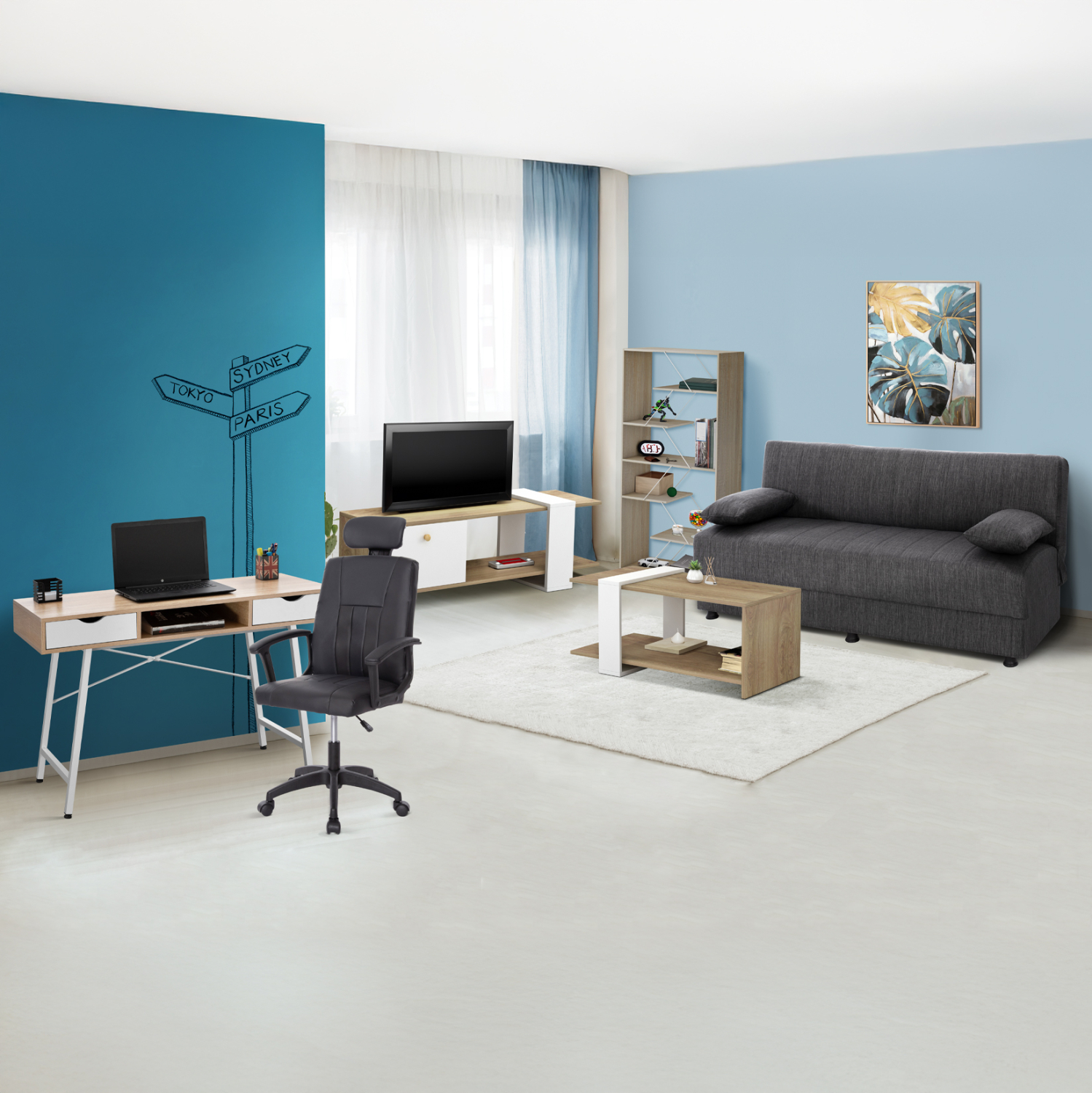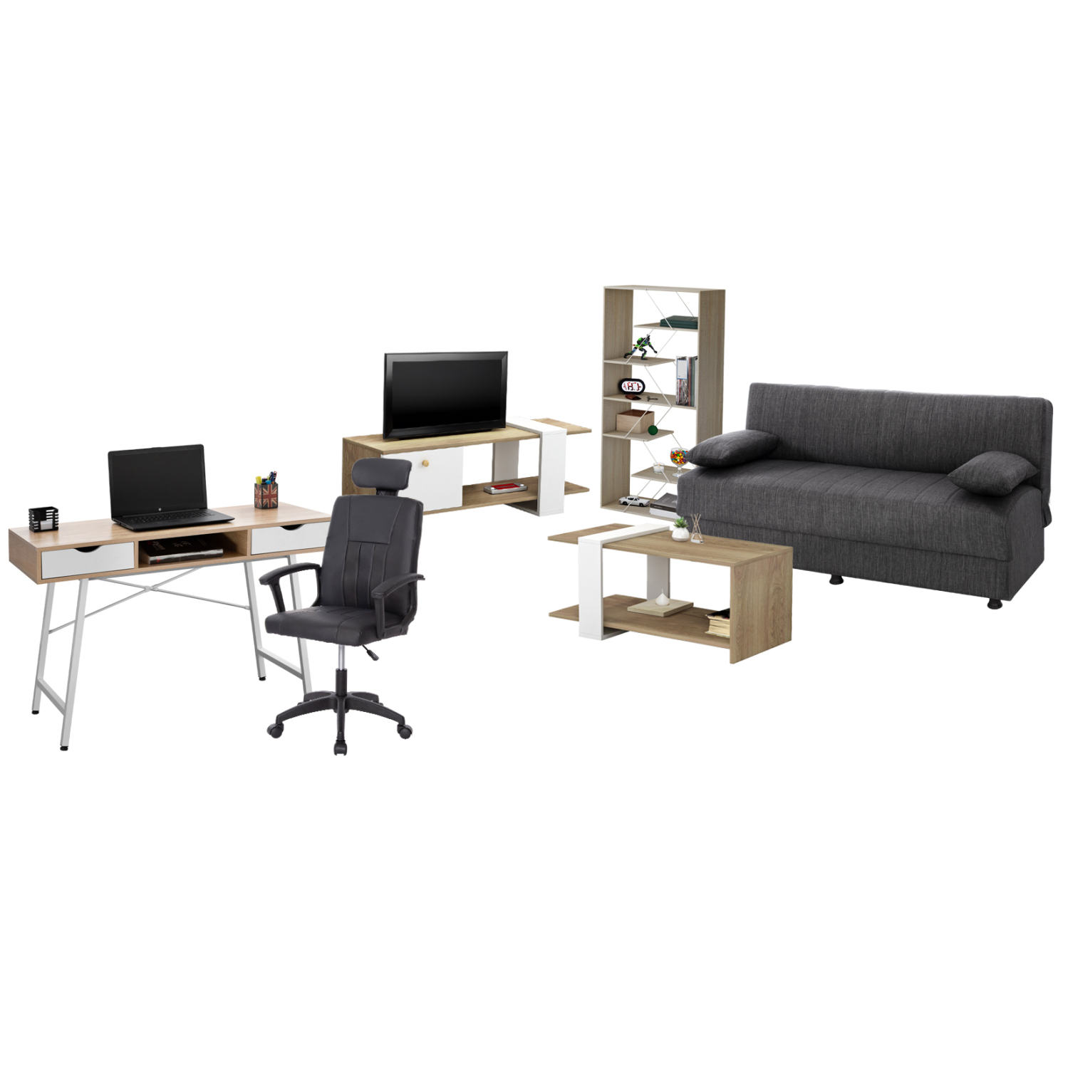 Αυτό το σετ περιλαμβάνει καναπέ-κρεβάτι, έπιπλο τηλεόρασης, βιβλιοθήκη, τραπέζι σαλονιού, γραφείο, καρέκλα γραφείου!
