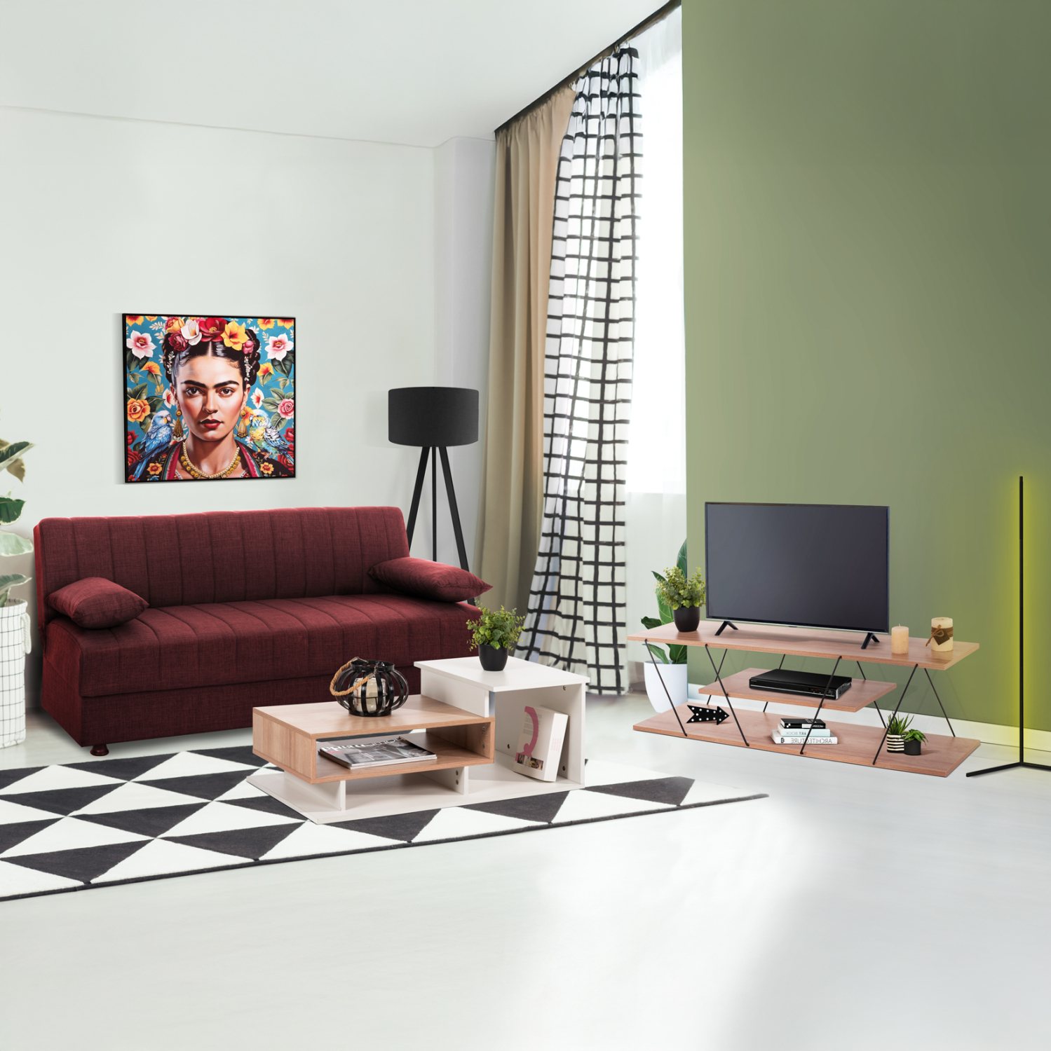 Αυτό το σετ περιλαμβάνει καναπέ κρεβάτι, τραπέζι σαλονιού, έπιπλο τηλεόρασης.