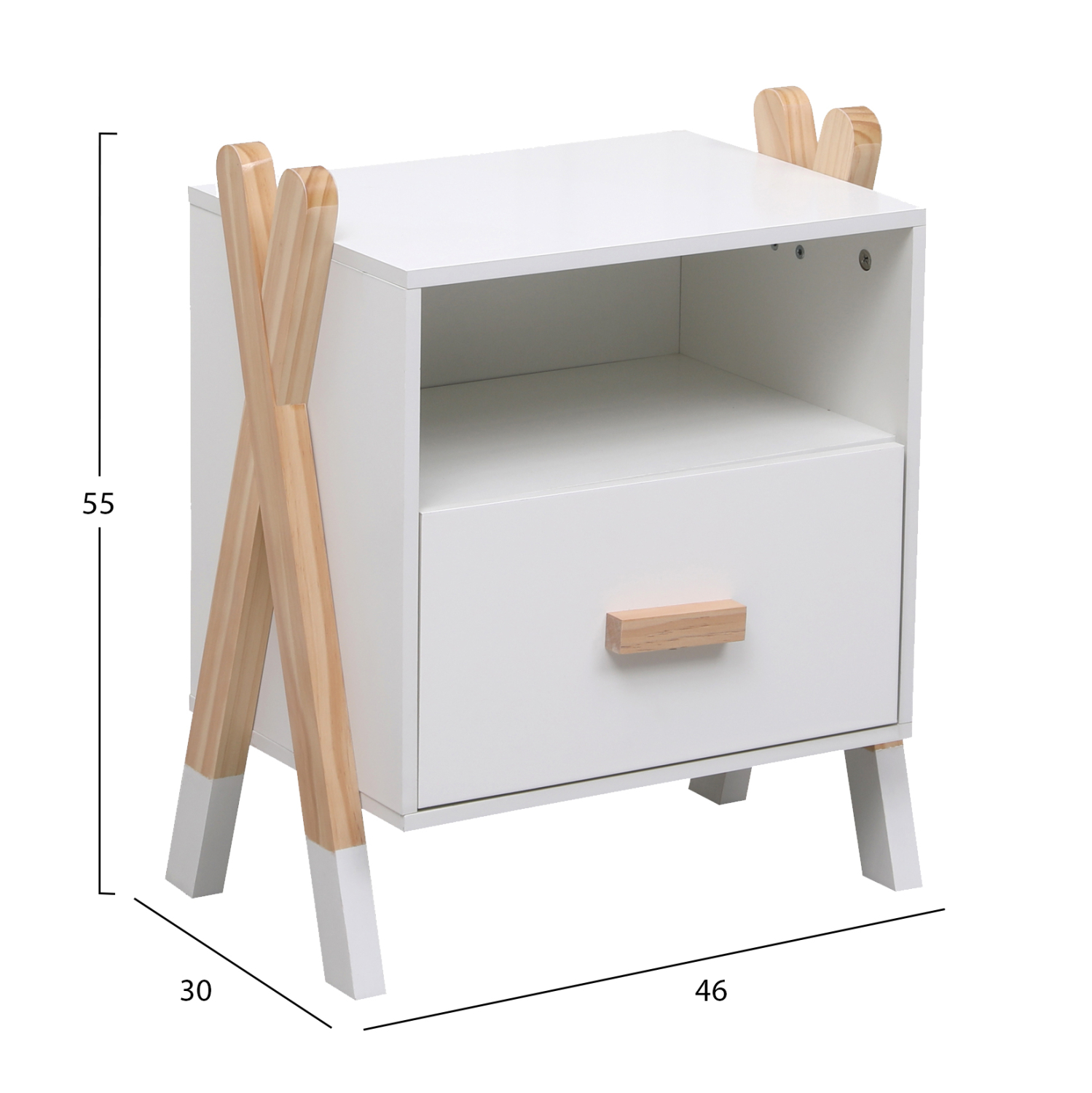 Παιδικό κομοδίνο μελαμίνης σε ΛΕΥΚΟ χρώμα με σκελετό ξύλου πεύκου σε χιαστί διάταξη.