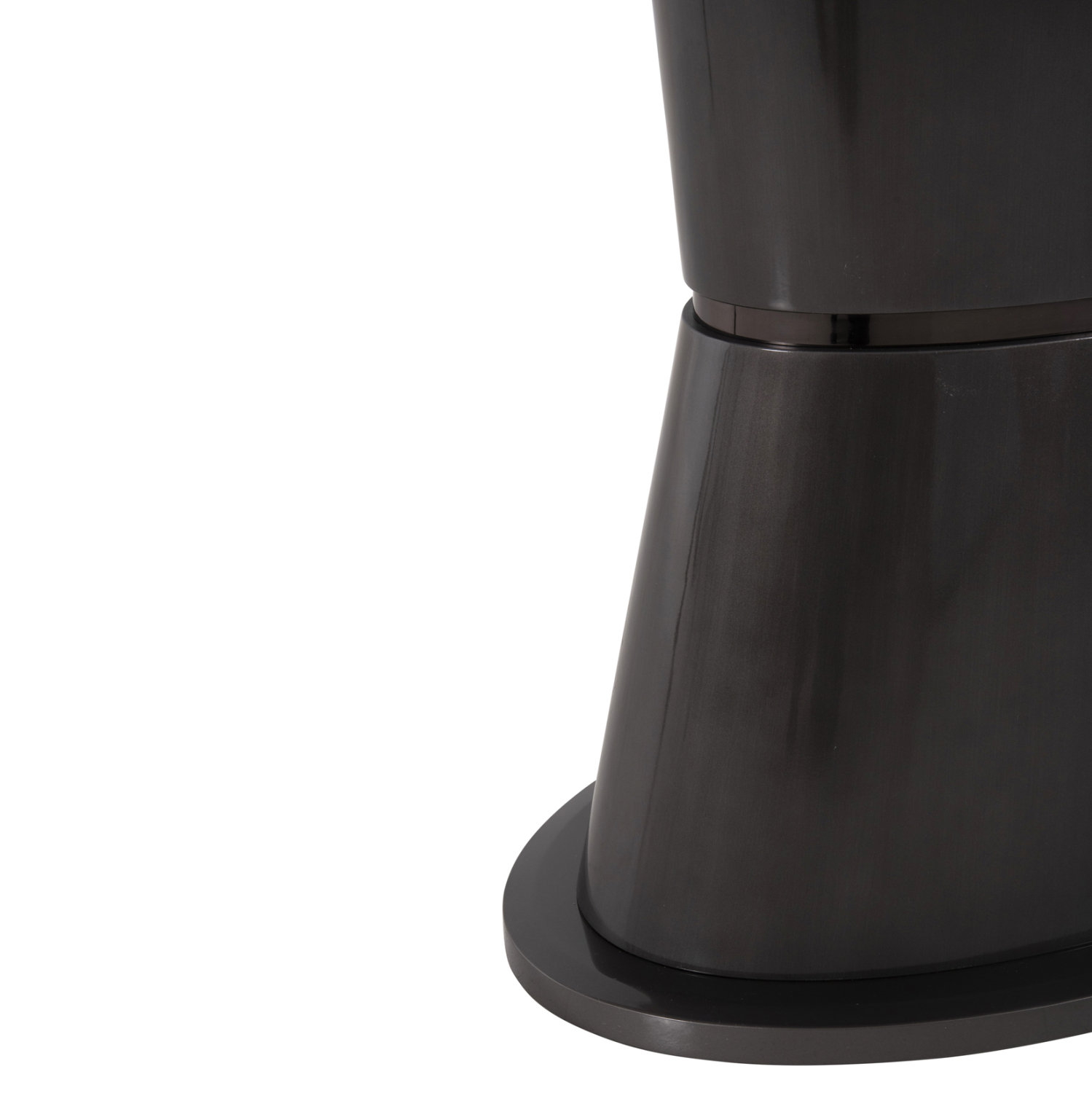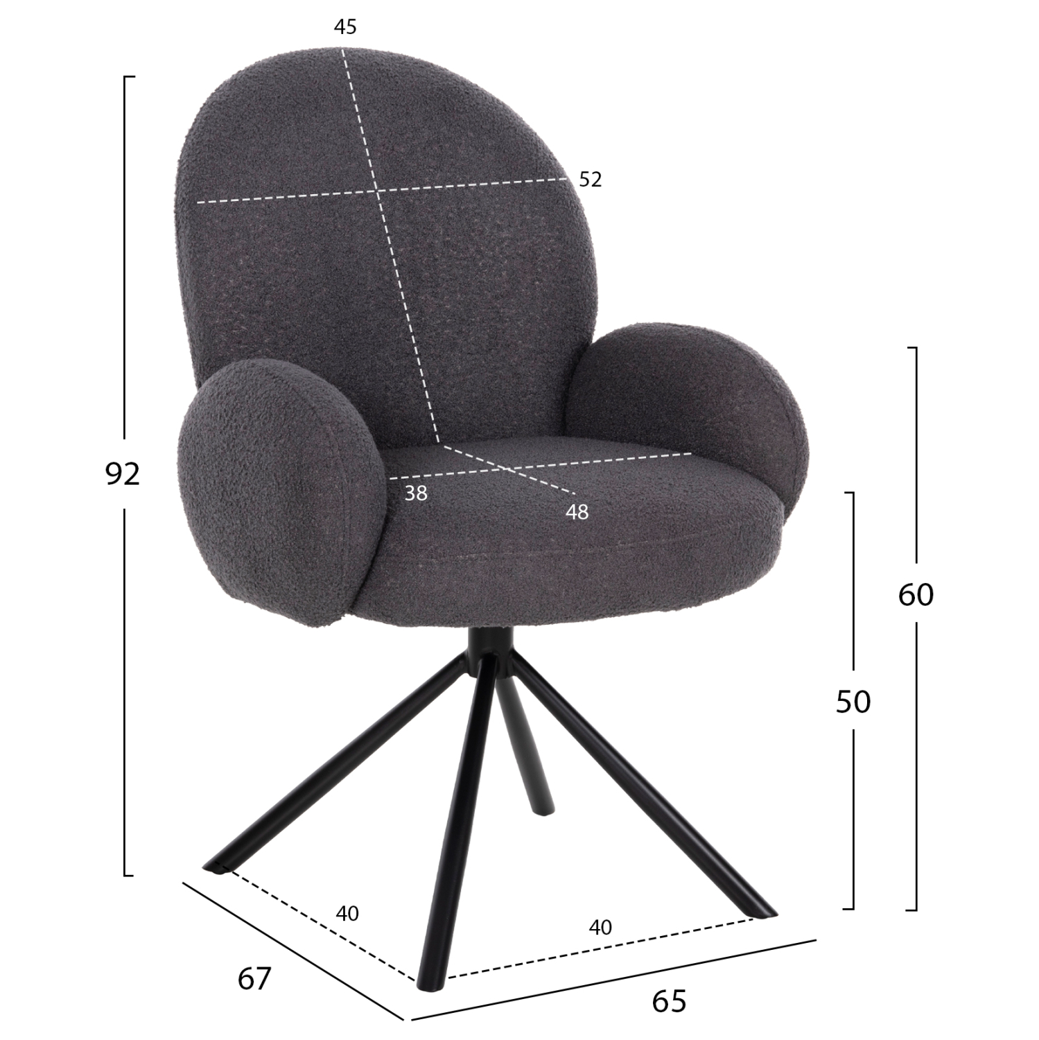 Αυτό το σετ τραπεζαρίας εσωτερικού χώρου αποτελείται από ένα τραπέζι BENT και 6 πολυθρόνες WINON. Το BENT είναι ένα μεγάλο τραπέζι τραπεζαρίας με μακρύ οβάλ σχήμα επιφανείας, η οποία στηρίζεται σε μια πανέμορφη οβάλ βάση. Η επιφάνεια είναι κεραμική υψηλής ποιότητας από σχιστόλιθο σε χρωματισμό ΓΚΡΙ ΜΑΡΜΑΡΟΥ, ενώ η βάση είναι σε ΑΝΘΡΑΚΙ χρώμα από MDF. Οι πολυθρόνες WINON σε ΣΚΟΥΡΟ ΓΚΡΙ χρώμα στηρίζονται σε μια μαύρη μεταλλική σαγρέ τετράνυχη βάση στην οποία είναι τοποθετημένος ο πίρος περιστροφής, καθώς το ιδιαίτερο χαρακτηριστικό τους, είναι ότι η περιστρέφονται κατά 180 μοίρες και όχι πλήρως, και διαθέτουν αυτόματη επαναφορά στην αρχική τους θέση. Η επένδυση τους έχει γίνει με υψηλής ποιότητας TEDDY ύφασμα.