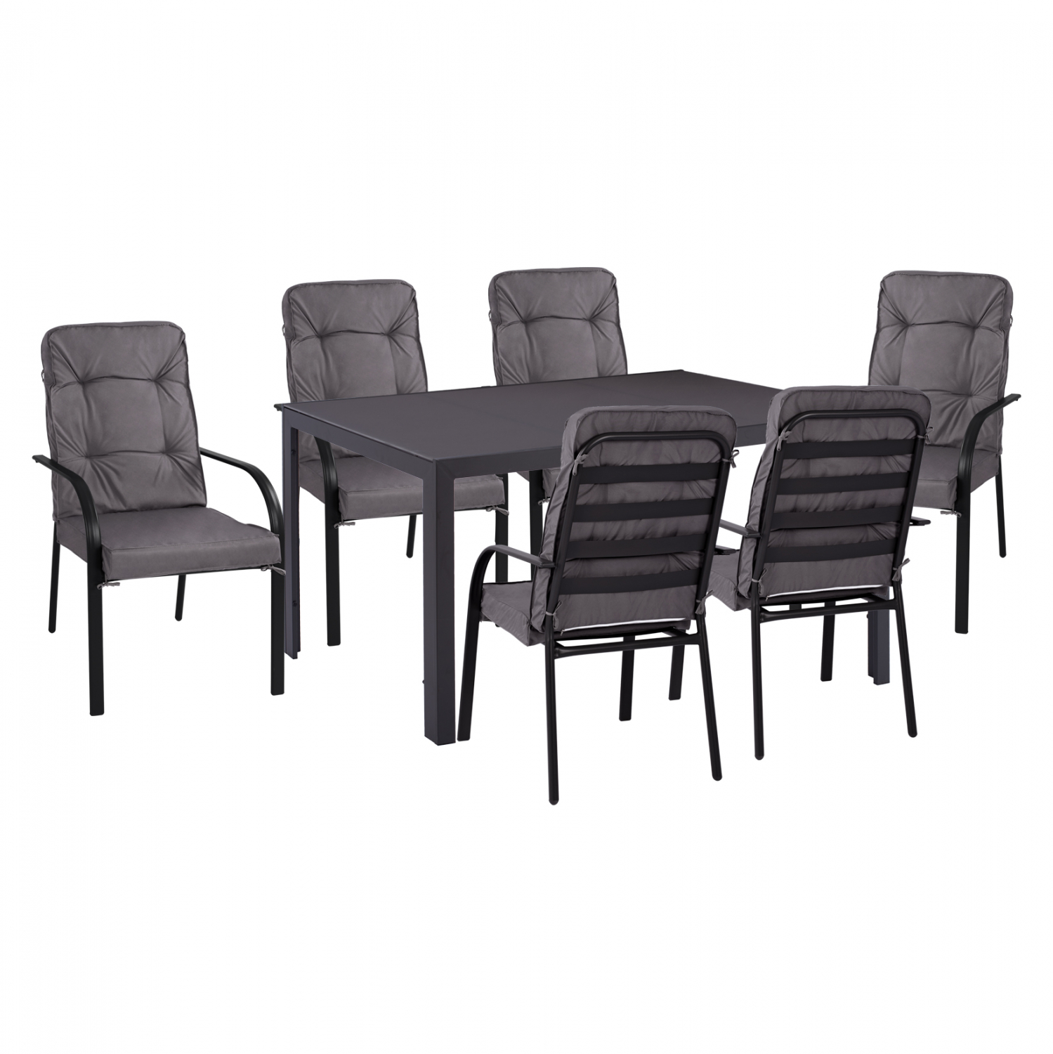 Ένα τραπέζι τραπεζαρίας εξωτερικού χώρου σε γκρι απόχρωση με γυαλί στην επιφάνειά του.