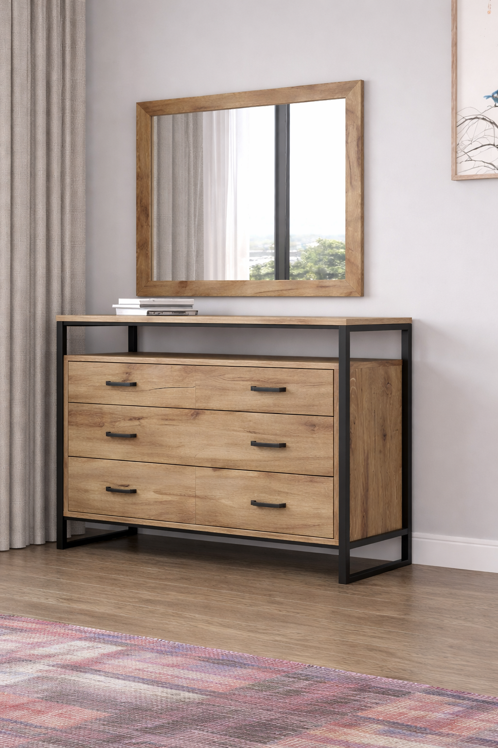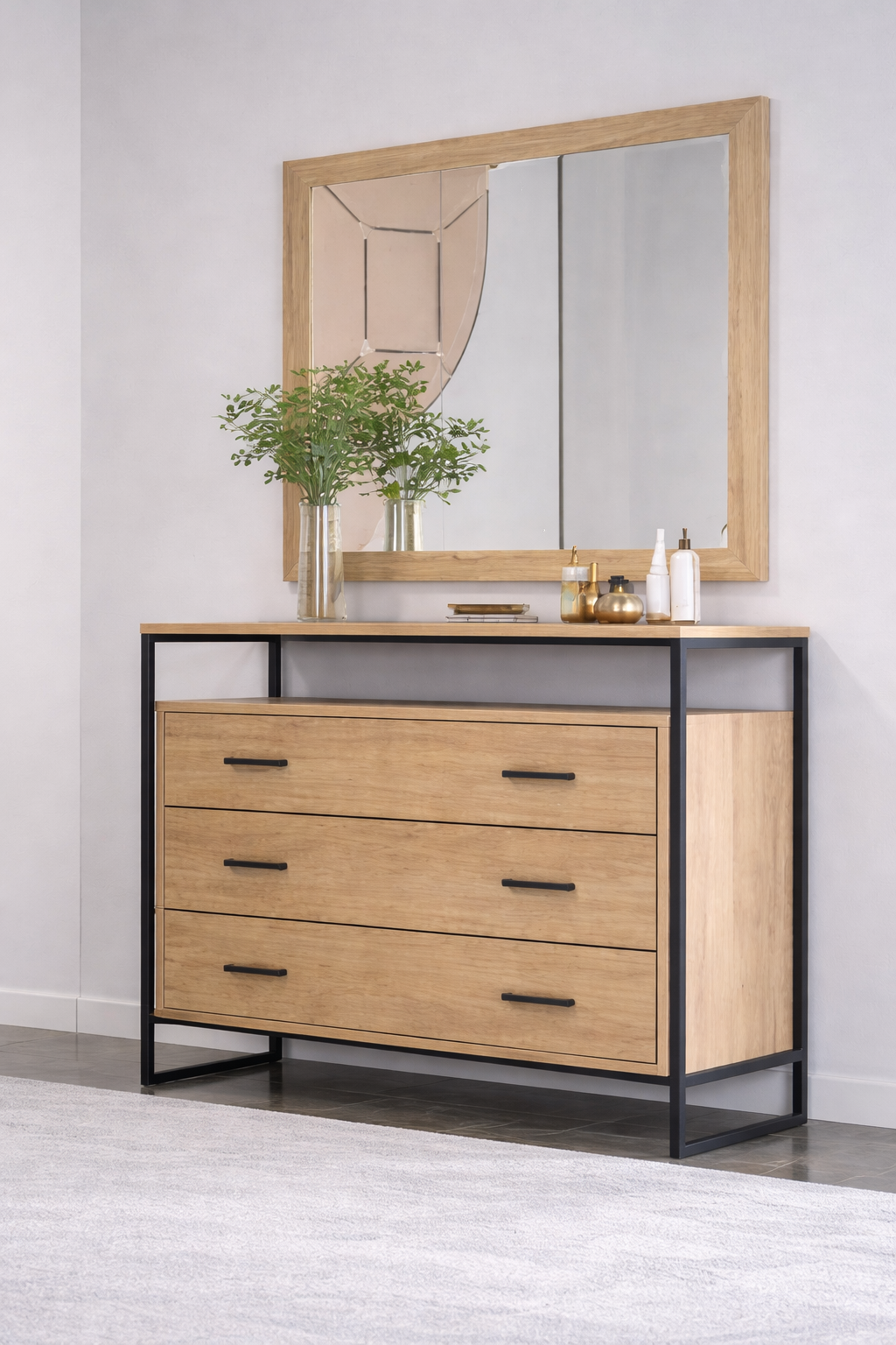 Κομψή και πρακτική συρταριέρα που συνδυάζει το φυσικό ύφος του ξύλου με τη μοντέρνα αισθητική του μεταλλικού σκελετού. Διαθέτει τρία ευρύχωρα συρτάρια που προσφέρουν άνετο αποθηκευτικό χώρο για ρούχα, λευκά είδη ή άλλα προσωπικά αντικείμενα, ενώ η ανθεκτική μεταλλική βάση χαρίζει σταθερότητα και ιδιαίτερο industrial χαρακτήρα.