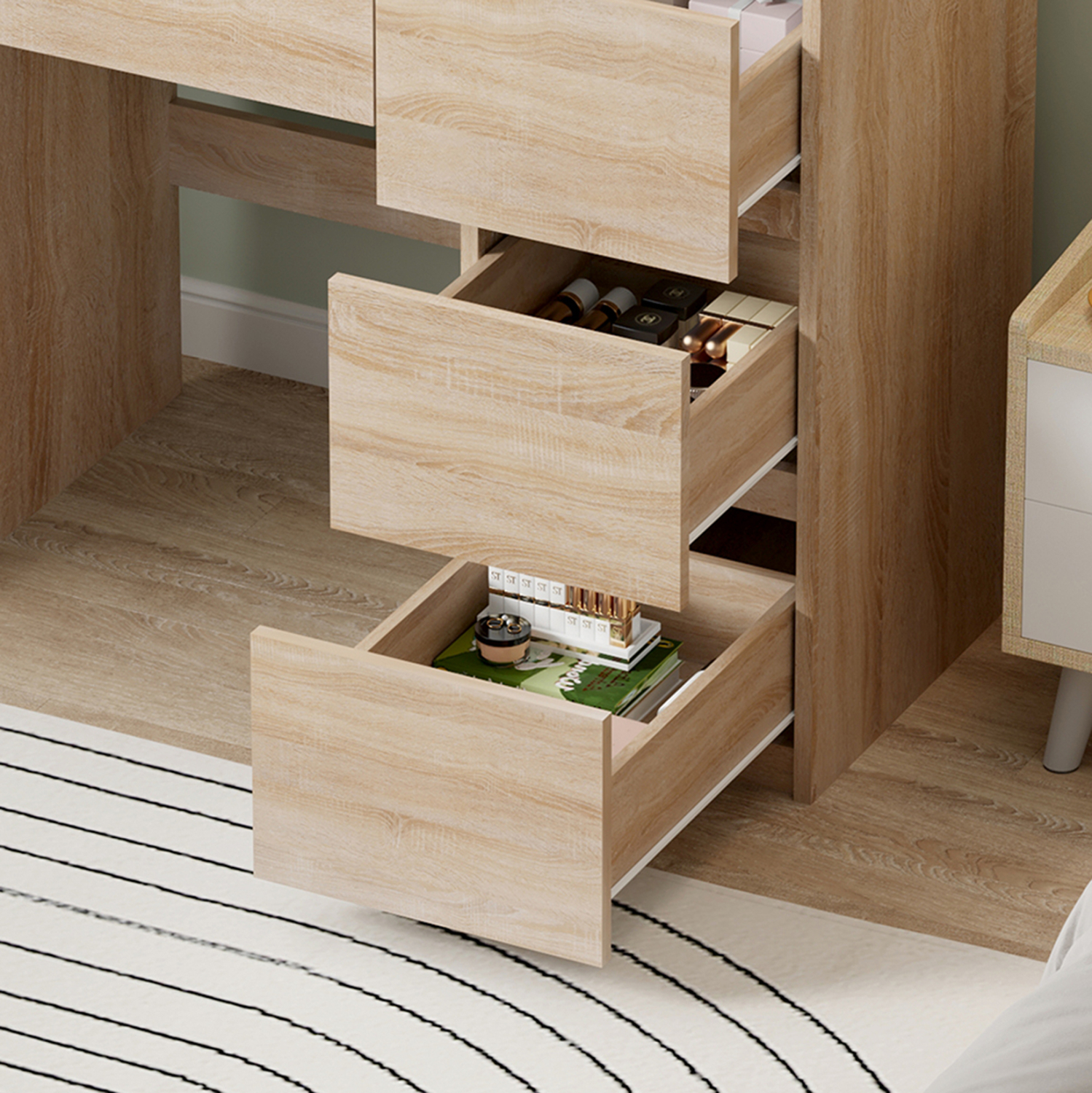 Η τουαλέτα KEITLIN είναι άλλη μια καινούργια προσθήκη στην γκάμα μας. Πρόκειται για ένα πρακτικότατο σύνολο που θα αλλάξει την εικόνα του χώρου σας. Αποτελείται από ένα τραπέζι με 4 συρτάρια. Ένα συρτάρι μακρόστενο κάτω από την επιφάνεια, κι άλλα 3 μεγαλύτερα στην δεξιά πλευρά. Αυτό όμως που κερδίζει τις εντυπώσεις είναι ότι ο καθρέπτης συνοδεύεται από φώτα LED περιμετρικά, απογειώνοντας την χρησιμότητα του επίπλου.