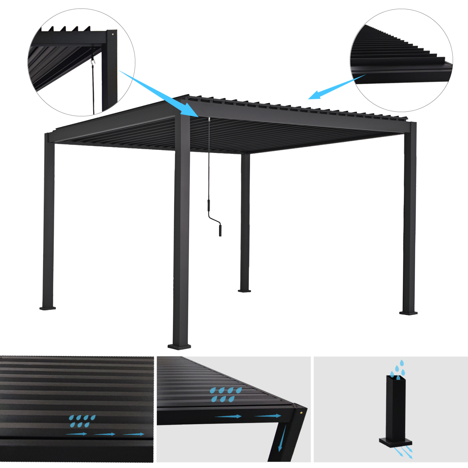 Ο χειροκίνητος μηχανισμός ΜΕ ΜΑΝΙΒΕΛΑ λειτουργεί ομαλά και αξιόπιστα, επιτρέποντας ακριβή ρύθμιση με ελάχιστη προσπάθεια, ενώ οι ενσωματωμένες υδροροές στις κολώνες της πέργκολας βοηθούν στην τέλεια απομάκρυνση των νερών σε περίπτωση βροχής.