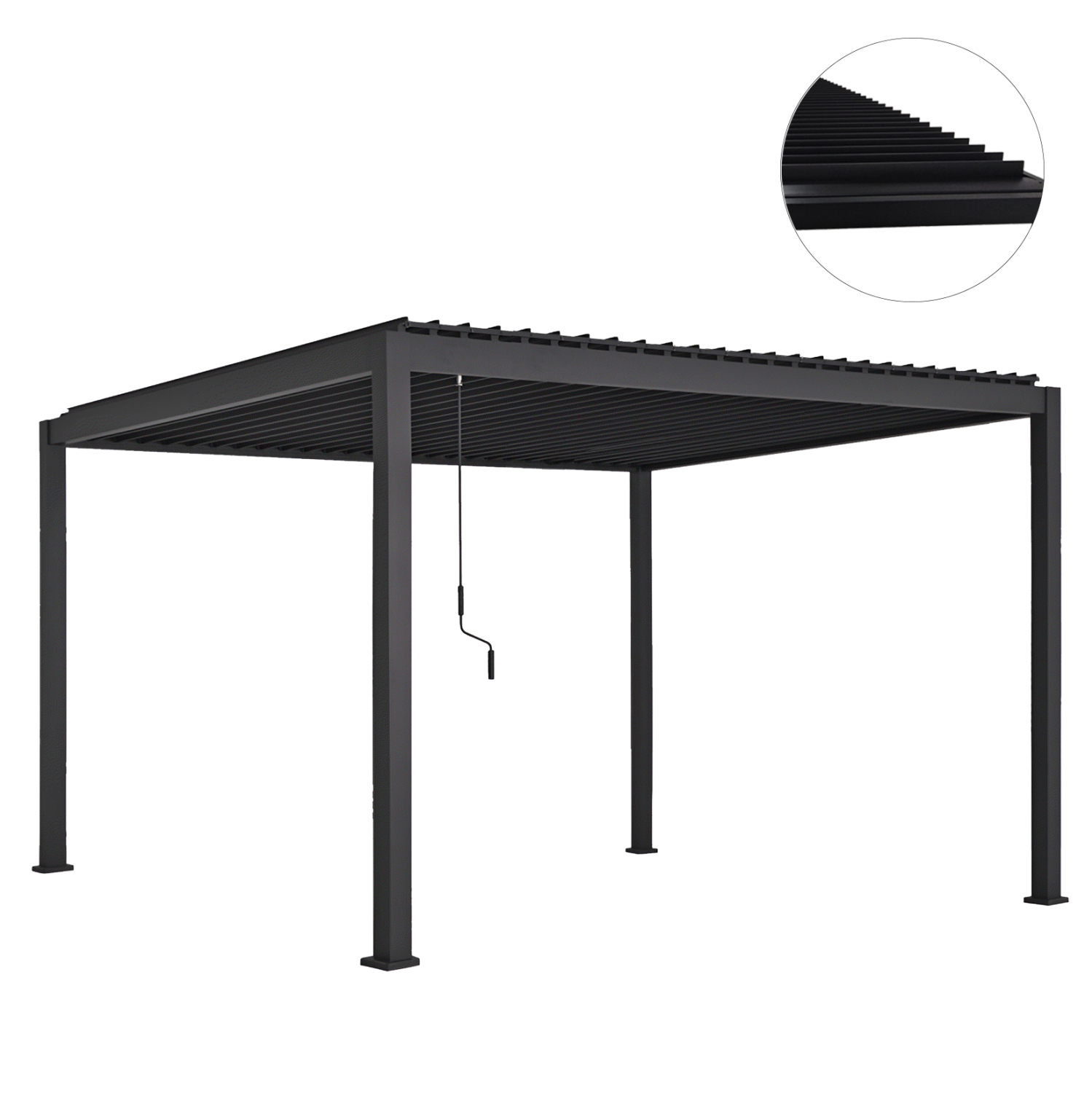 Ο χειροκίνητος μηχανισμός ΜΕ ΜΑΝΙΒΕΛΑ λειτουργεί ομαλά και αξιόπιστα, επιτρέποντας ακριβή ρύθμιση με ελάχιστη προσπάθεια, ενώ οι ενσωματωμένες υδροροές στις κολώνες της πέργκολας βοηθούν στην τέλεια απομάκρυνση των νερών σε περίπτωση βροχής.