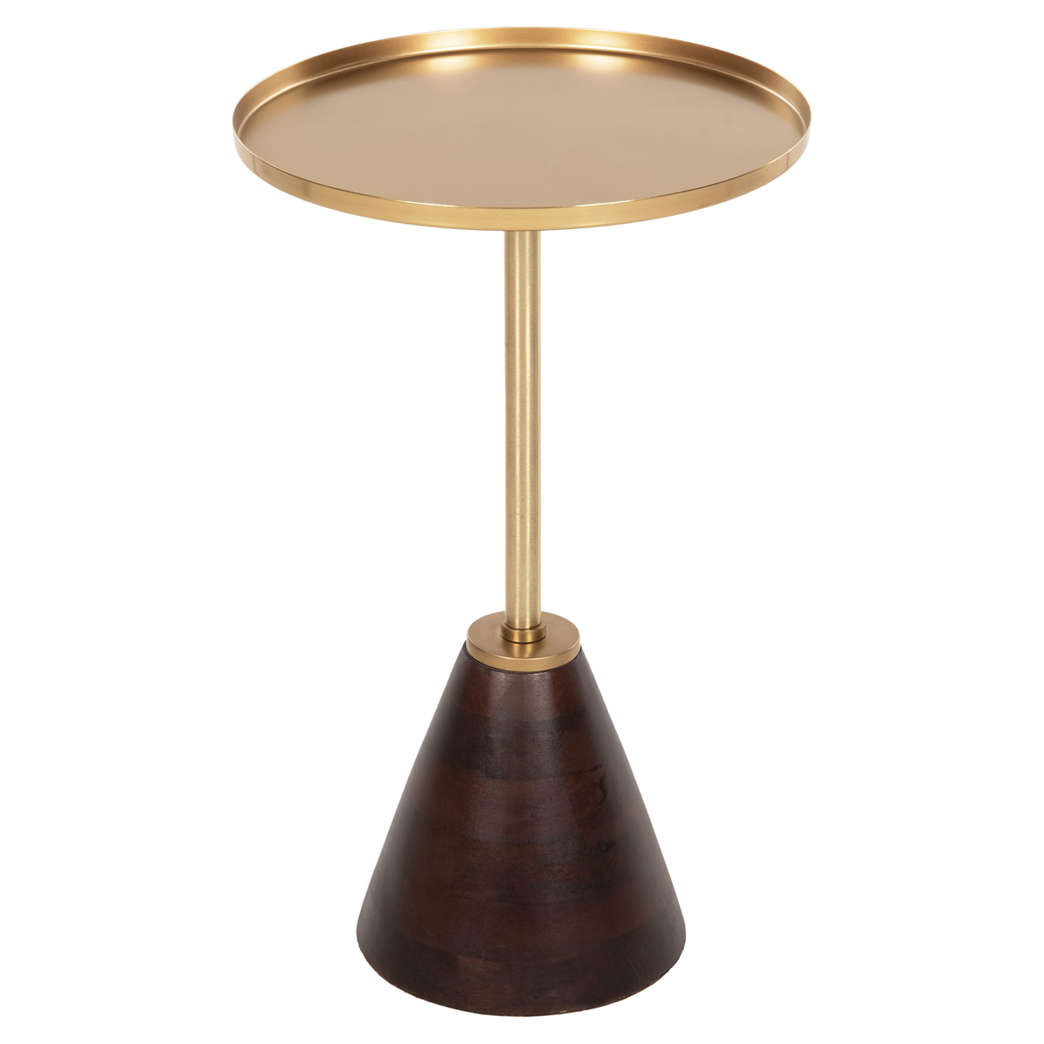 Το βοηθητικό τραπεζάκι KAPPUR σίγουρα θα τραβήξει τα βλέμματα και δικαιολογημένα. Διαθέτει κωνική βάση από πολυτελές ξύλο MANGO σε ελκυστικό ΚΑΡΥΔΙ χρώμα, η οποία συνδέεται με την ΧΡΥΣΗ μεταλλική στρογγυλή επιφάνεια με μια λεπτή μεταλλική κολώνα που προσδίδει αξεπέραστη κομψότητα στο σύνολο. Ιδανικό τόσο για το σπίτι, όσο και για επαγγελματικούς χώρους.